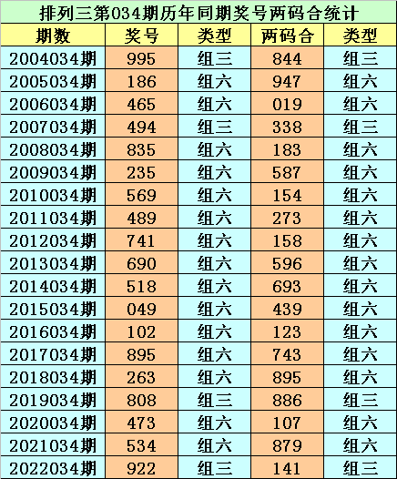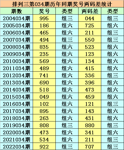 陈设三从2004年开奖于今已开出6454期奖号了,其中第034期历史同时奖号出现19次,积年第034期永诀开出号码:995、186、465、494、835、235、569、489、741、690、518、049、102、895、263、808、473、534、922。